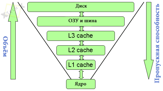 Как вы могли уже понять, система тратит большое количество времени перемещая информацию с одного места в другое. Первоначально машинные инструкции хранятся на диске, перед исполнением они загружаются в оперативную память, а затем во время исполнения они копируются с памяти в процессор. Некоторые данные затем отображаются на мониторе, как строка Hello, World! в прошлом примере. С точки зрения программиста вся эта мешанина имеет очень мало полезной работы, поэтому самая главная цель системных инженеров - сделать так, чтобы эти операции протекало максимально быстро, почти мгновенно. Законы физики диктуют, что чем больше устройство по размеру и объему памяти, тем оно медленнее. Также чем быстрее устройство, тем дороже будет обходиться ее производство. К примеру, жесткий диск может вмещать 1000 раз больше информации, чем ОЗУ. Но при этом чтение байтов может быть 10,000,000 раз медленнее. Таким же образом, регистровый файл может хранить до несколько сотен байт информации, но при этом он в 100 раз быстрее оперативной памяти. Хотя, индустрия полупроводников прогрессирует, эта разница между процессором и памятью только продолжает увеличиваться. Гораздо легче ускорять работу процессоров, чем памяти. Чтобы уменьшить эту разницу между процессором и памятью были придуманы маленькие и быстрые устройства, которые называют кэшем. Они служат промежуточным хранилищем для тех байтов информации, в которых процессор будет нуждаться в ближайшем будущем. Кэши делятся на уровни, обычно это L1, L2 и L3 кэши(L3 более современное нововведение). Наверно вы уже догадались, что каждый уровень предоставляет больше памяти, но при этом хуже по скорости. Чтение с L1 кэша по скорости ближе к чтению с регистра, а L2 кэш подсоединен специальной шиной прямо к процессору. Кэши используют такую технологию как SRAM(static random access memory). Главная идея, которую реализуют кэши - это локальность данных, свойство программ использовать повторно одни и те же ячейки памяти через короткое время (временная локальность), либо использовать ячейки памяти с близкими значениями адресов (пространственная локальность). Также хочу добавить то, что кэши отсылают нас к расширенной гарвардской архитектуре компьютера, но это отдельная большая тема. Запоминающие устройства в компьютерной системе образуют пирамиду или иерархию памяти, которую вы можете лицезреть снизу.