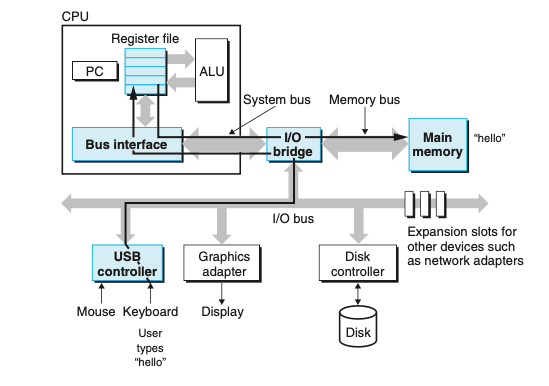 Устройства ввода/вывода. Эти устройства связь нашей системы с внешним миром. К примеру наша система может иметь 4 таких устройства: компьютерная мышь и и клавиатура для ввода пользователя, монитор для вывода к пользователю, жесткий диск для долгосрочного хранения данных и программ. Первоначально, исполняемый файл hello хранится на диске. Каждое устройство ввода/вывода(дальше буду называть I/O устройство) подсоединяется к I/O шине с помощью контроллера или адаптера. Разница между ними в том, что контроллер является либо частью самого устройства, либо материнской платы, а адаптер внешне подключается к разъему(сокету) на материнской плате.