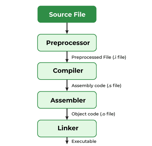 - Фаза предварительной обработки. Эта фаза происходит благодаря препроцессору, которая реализована уже на C++. Препроцессор изменяет оригинальный файл на языке C в соответствии с директивами, начинающимися с символа решетки '#'. В нашей программе есть такая директива #include <stdio.h>. Препроцессор видит данную команду и вставляет код из файла-заголовка stdio.h прямо в нашу программу. В результате этой фазы получаем файл с расширением .i